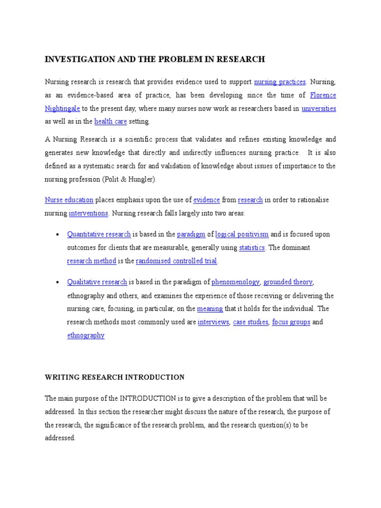 The question should be focused, specific, and researchable within the constraints of your. Nursing research covers key issues, including health promotion, human responses to illness. Between 1928 and 1959 only 2 out of 152 studies reported a theoretical basis for the research design. Conducting a pilot/trial study population 8. It usually predicts a relationship between two or more variables.